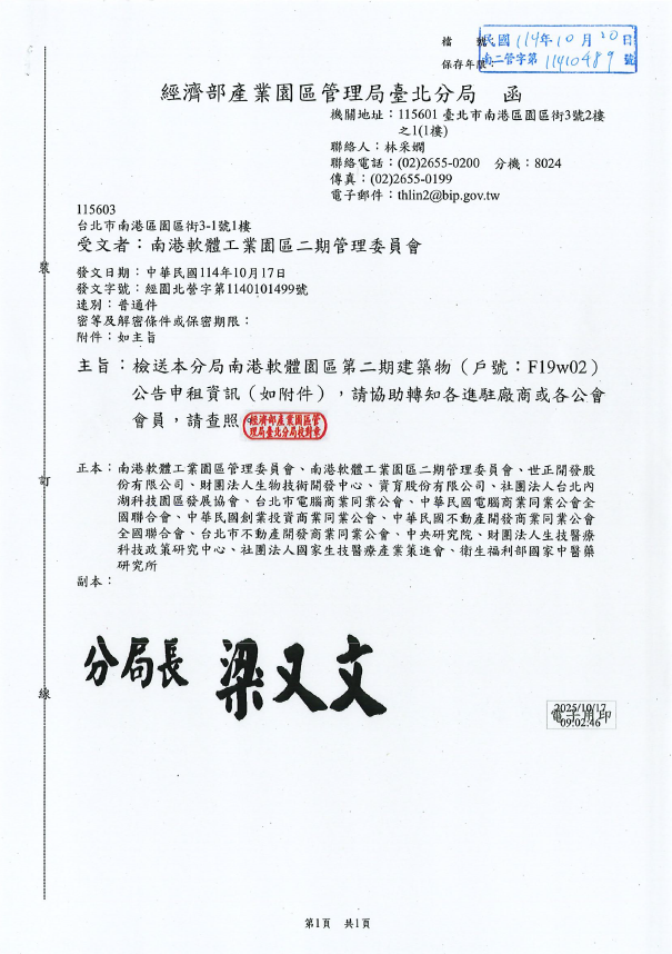 【函文公告】檢送本分局南港軟體園區第二期建築物(户號:F19w02) 公告申租資訊(如附件),請協助轉知各進駐廠商或各公會 會員,請查照