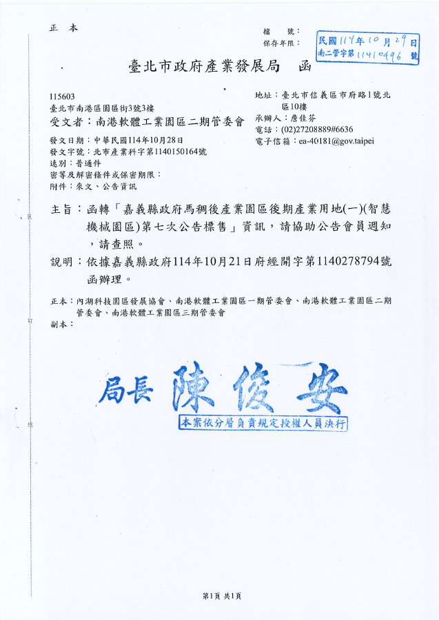 【函文公告】函轉「嘉義縣政府馬稠後產業園區後期產業用地(一)(智慧 機械園區)第七次公告標售」資訊,請協助公告會員遇知 ,請查照。