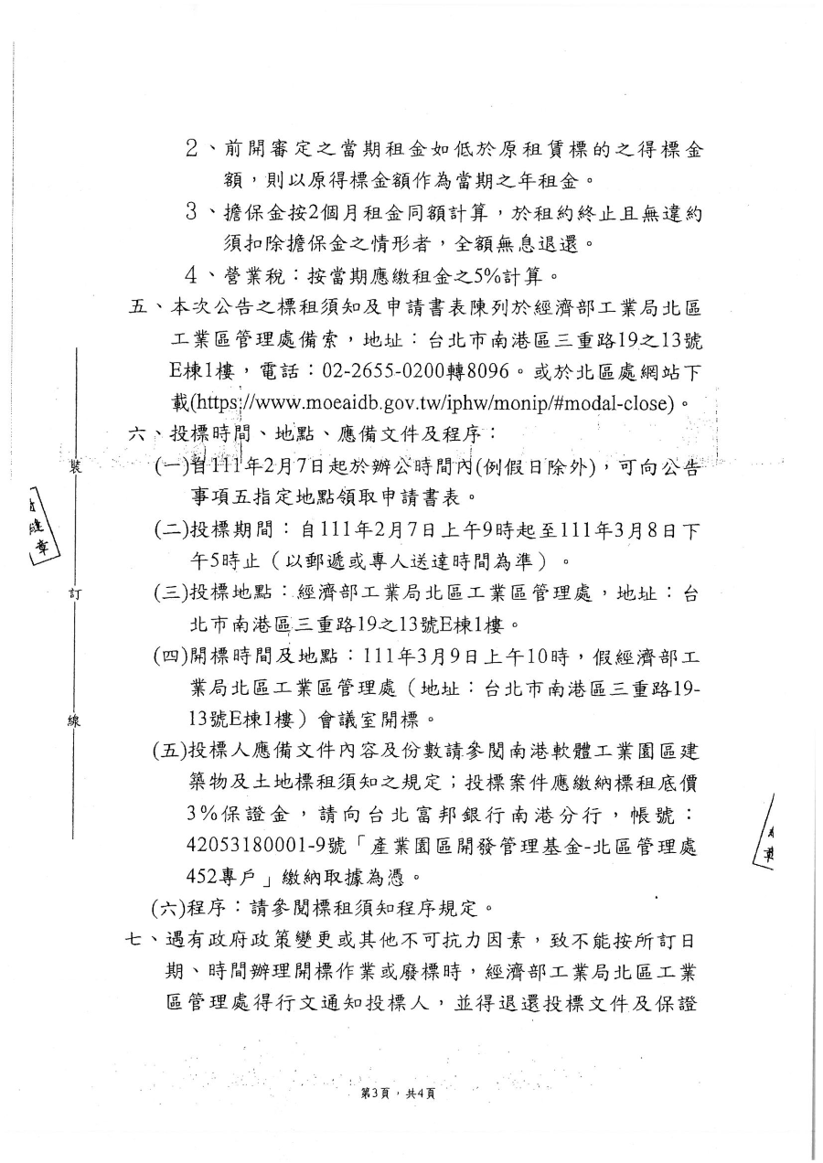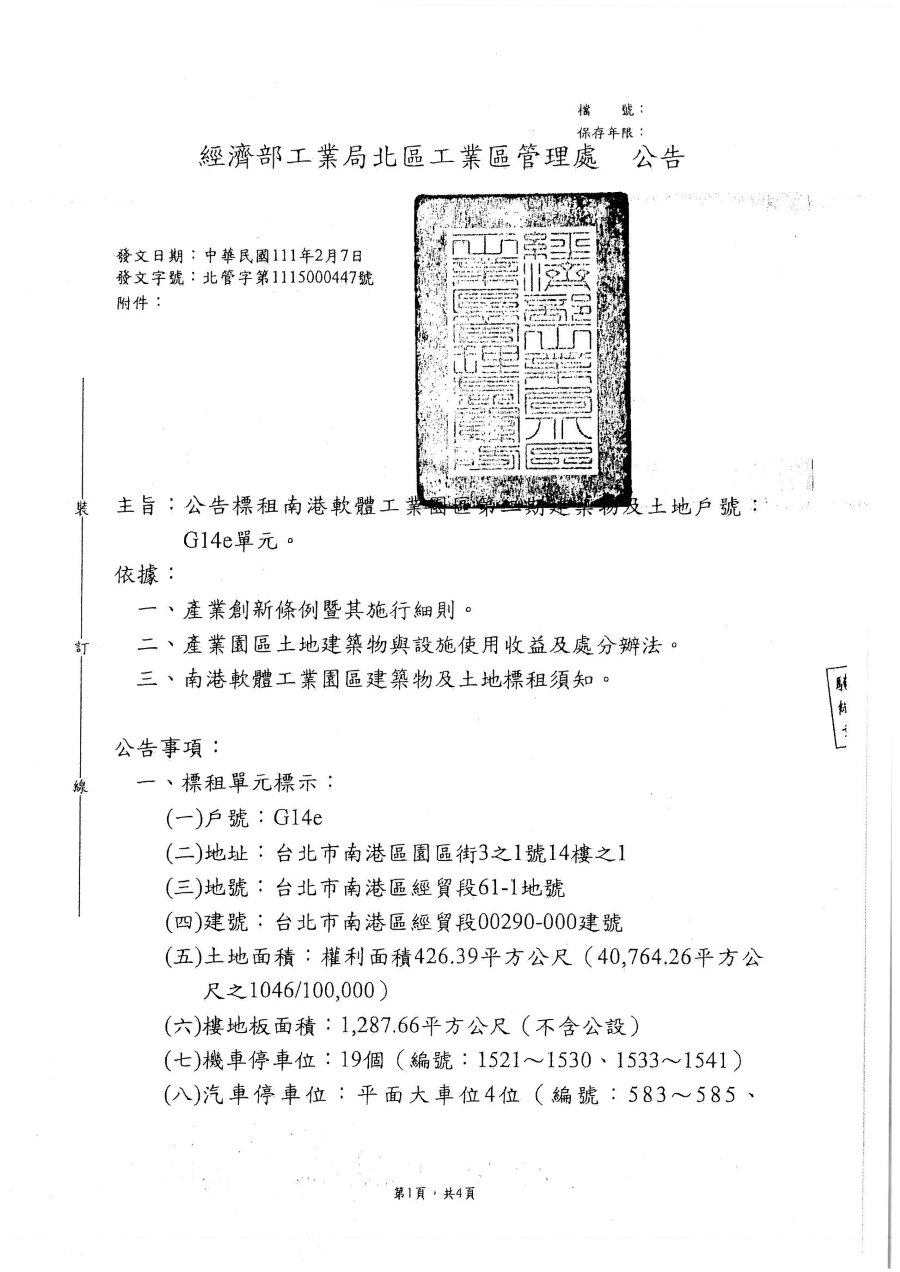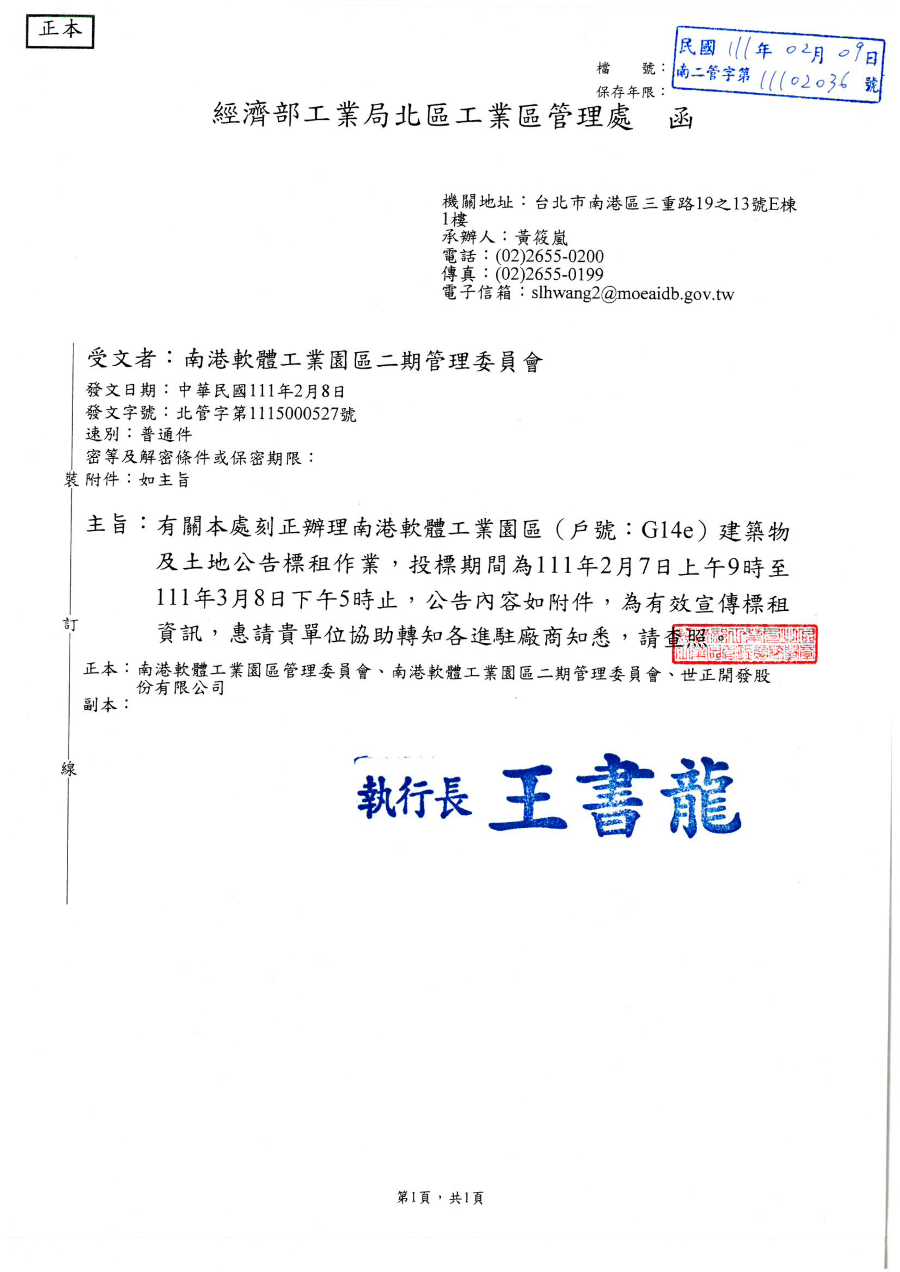 南二管字第11102036號經濟部工業局北區工業區管理處來函辦理南港軟體工業園區二期建築物及土地公告標租作業,轉知進駐戶載用,呈請 鑒核。(new)