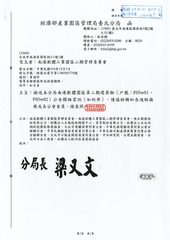 【函文公告】檢送本分局南港軟體園區第二期建築物(戶號:F03w01、F03w02)公告標租資訊(如附件),請協助轉知各進駐廠商或各公會會員,請查照。