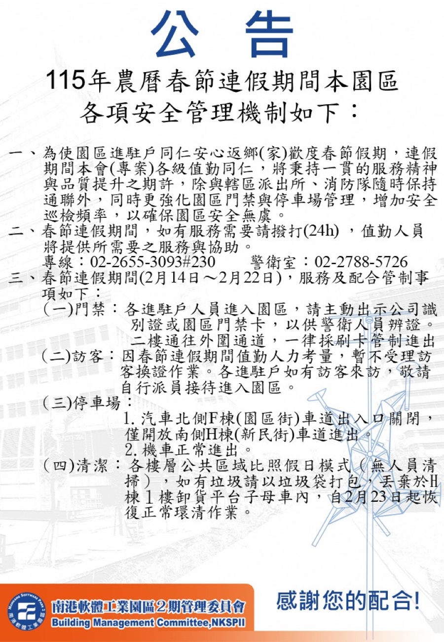 【園區公告】 115年農曆春節連假期間本園區各項安全管理機制