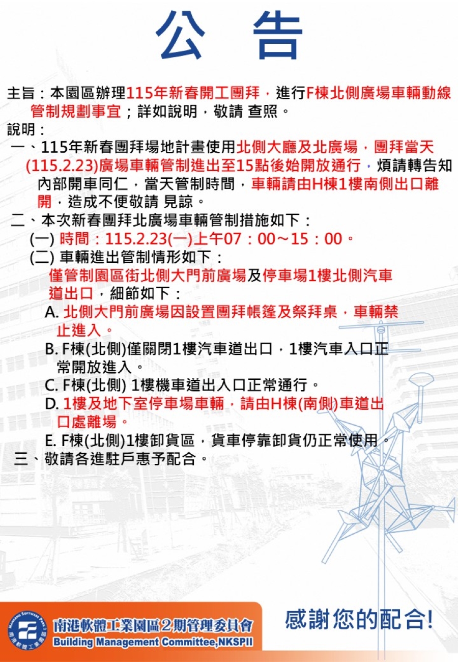 【園區公告】本園區辦理115年新春開工團拜,進行F棟北側廣場車輛動線管制規劃事宜;詳如說明,敬請查照。