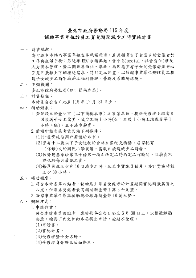 臺北市政府勞動局115年度補助事業單位於員工育兒期間減少工時實施計畫.pdf