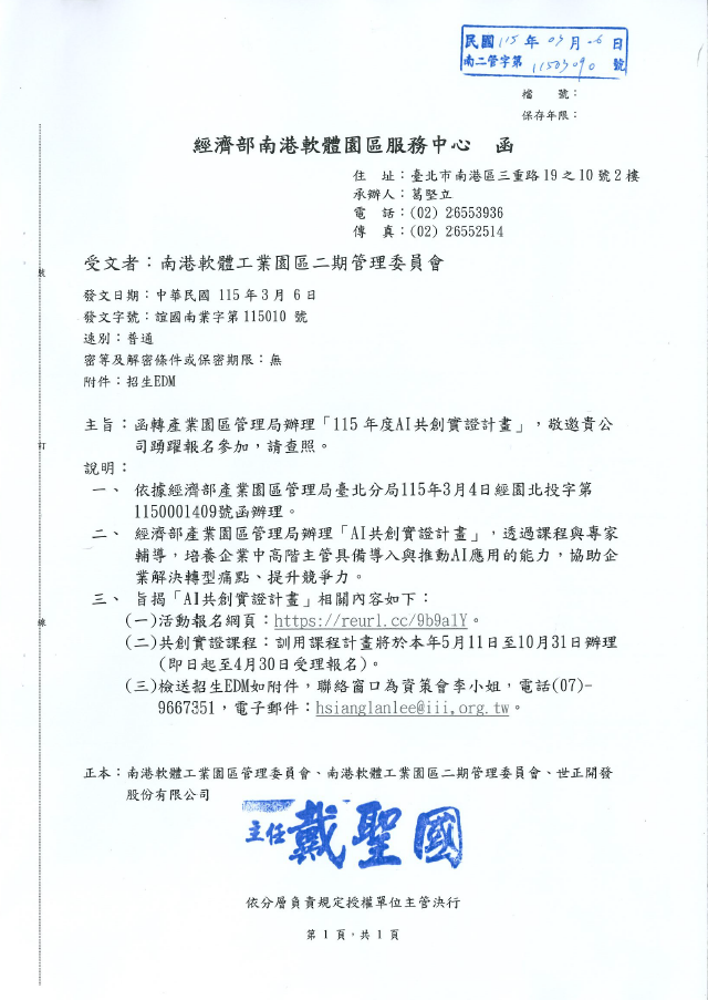 【函文公告】函轉產業園區管理局辦理「115年度AI共創實證計畫」,敬邀貴公司踴躍報名參加,請查照。
