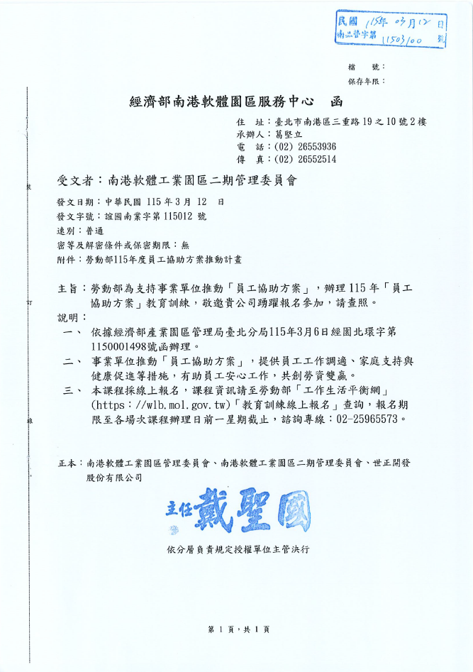【函文公告】勞動部為支持事業單位推動「員工協助方案」,辦理115年「員工協助方案」教育訓練,敬邀貴公司踴躍報名參加,請查照。