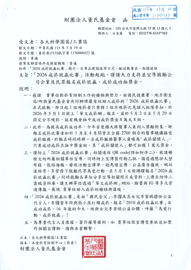 【函文公告】「2026戒菸就赢比賽」活動起跑,謹請大力支持並宣導鼓勵公司企業及民眾報名戒菸就贏、戒菸成功抽獎金。