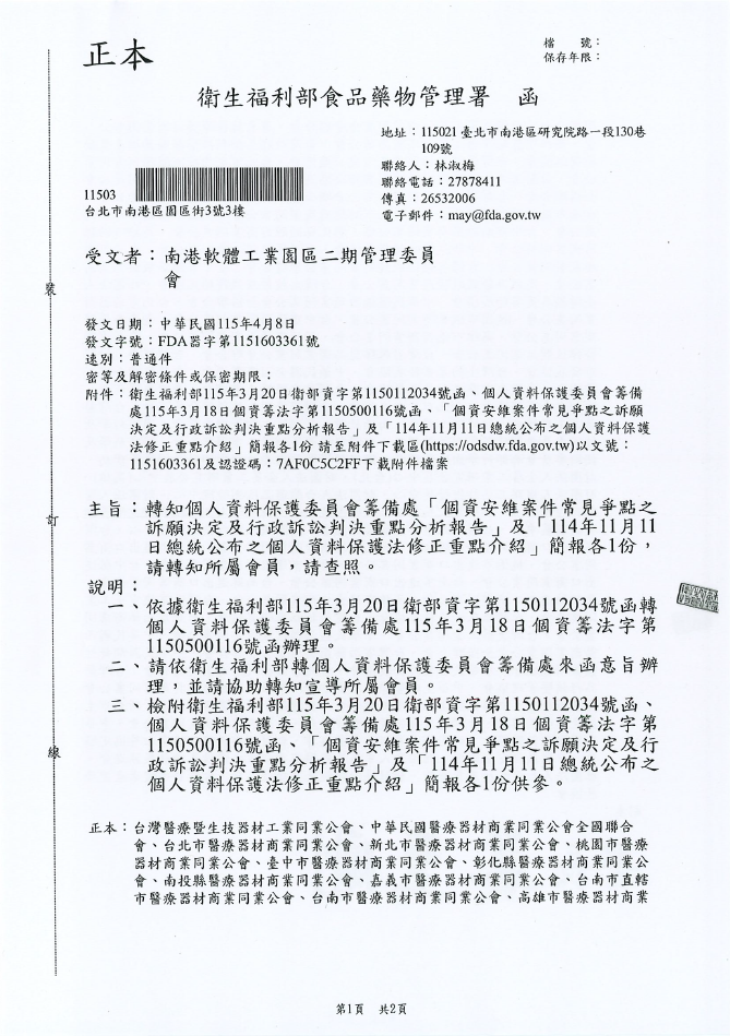 【函文公告】轉知個人資料保護委員會籌備處「個資安維案件常見爭點之訴願決定及行政訴訟判決重點分析報告」及「114年11月11日總統公布之個人資料保護法修正重點介紹」簡報各1份,請轉知所屬會員,請查照。