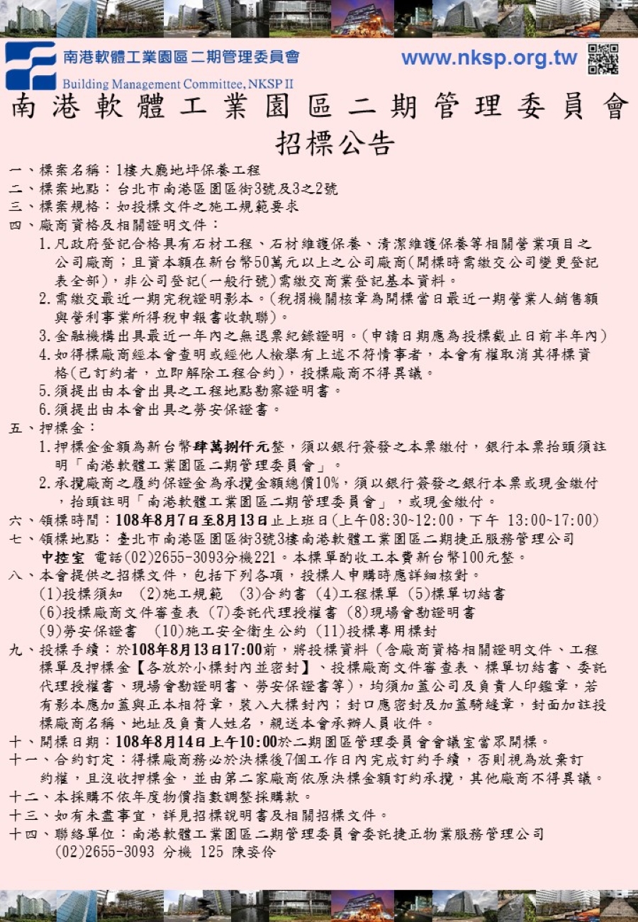 十、開標日期:108年8月14日上午10:00於二期園區管理委員會會議室當眾開標。