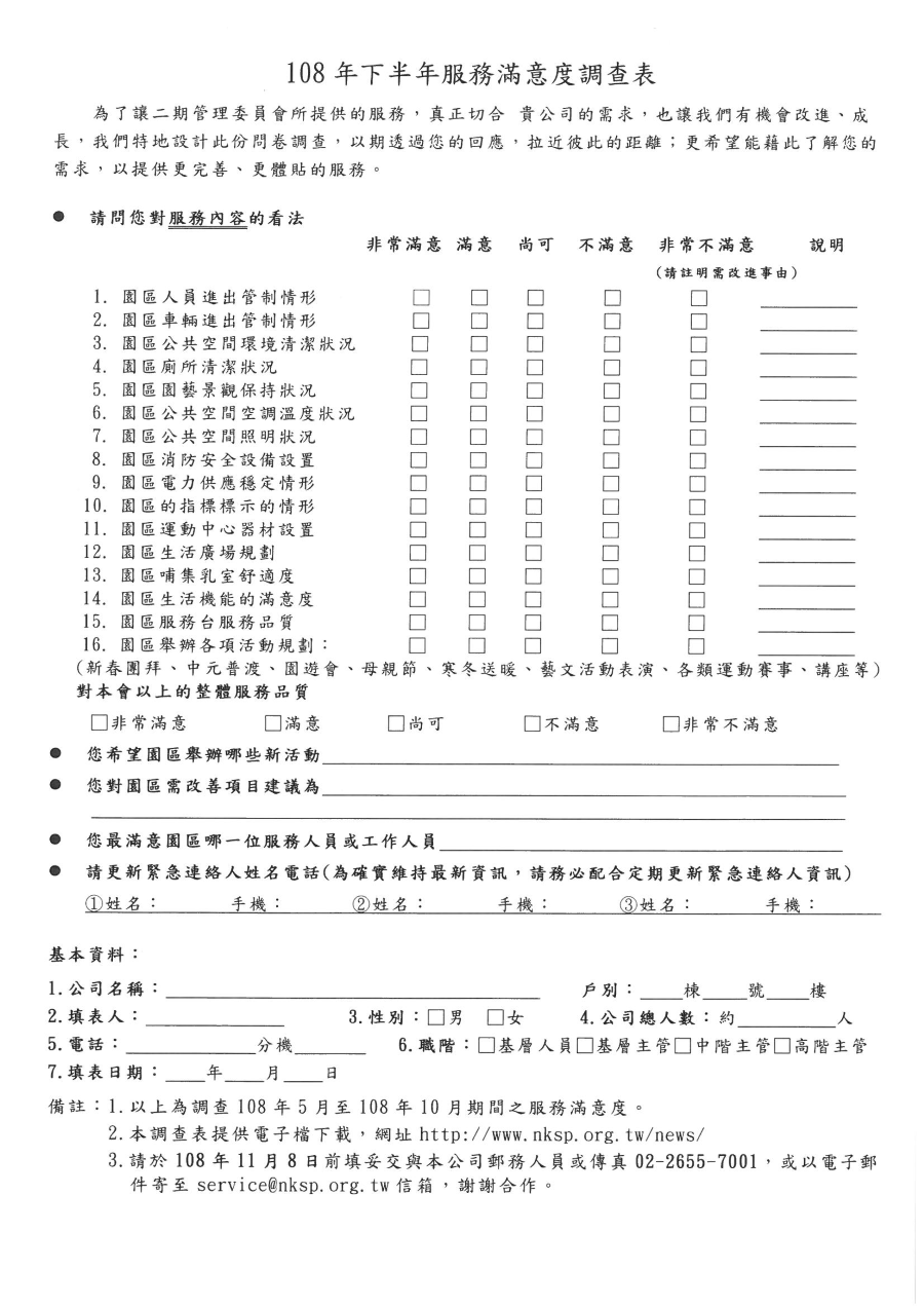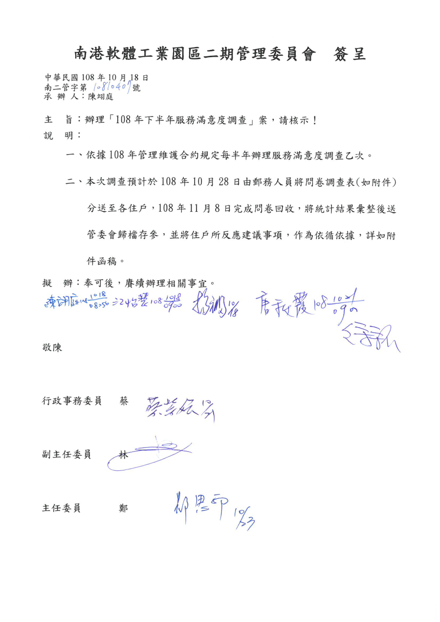 南二管字第10810407號辦理「108年下半年服務滿意度調查」案,請核示。