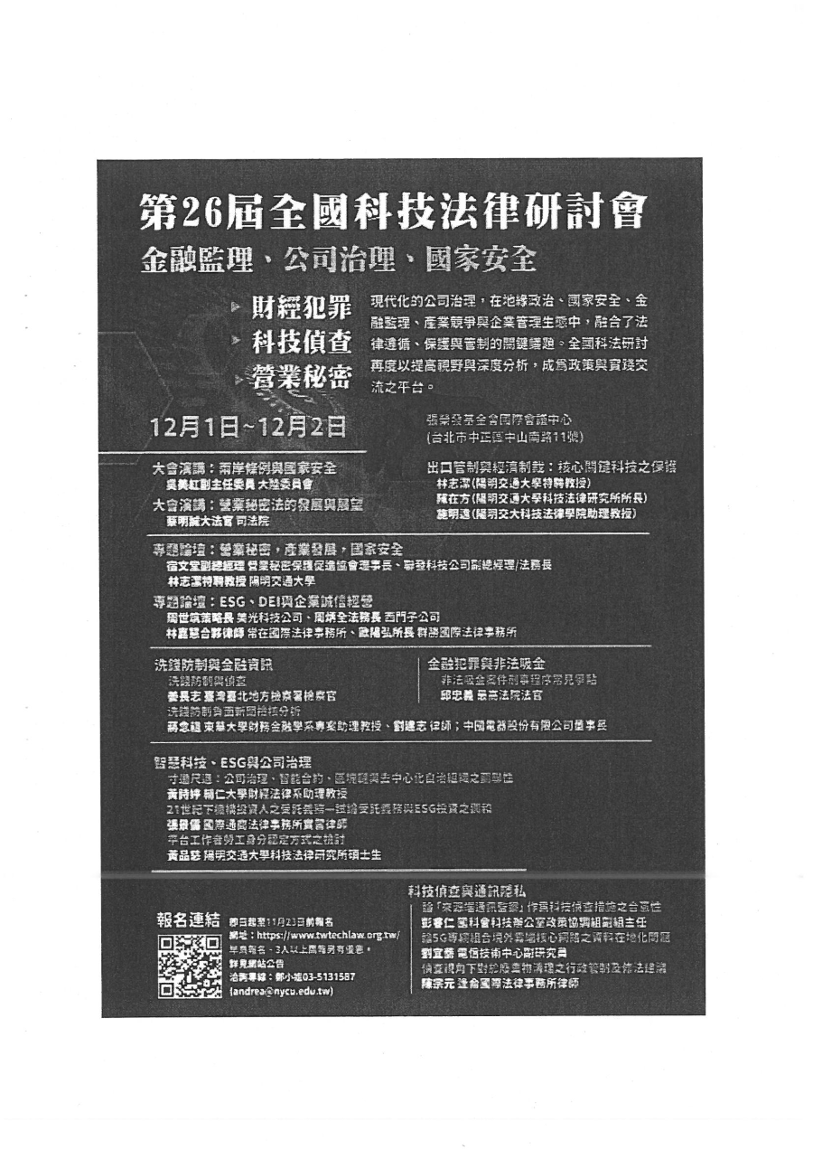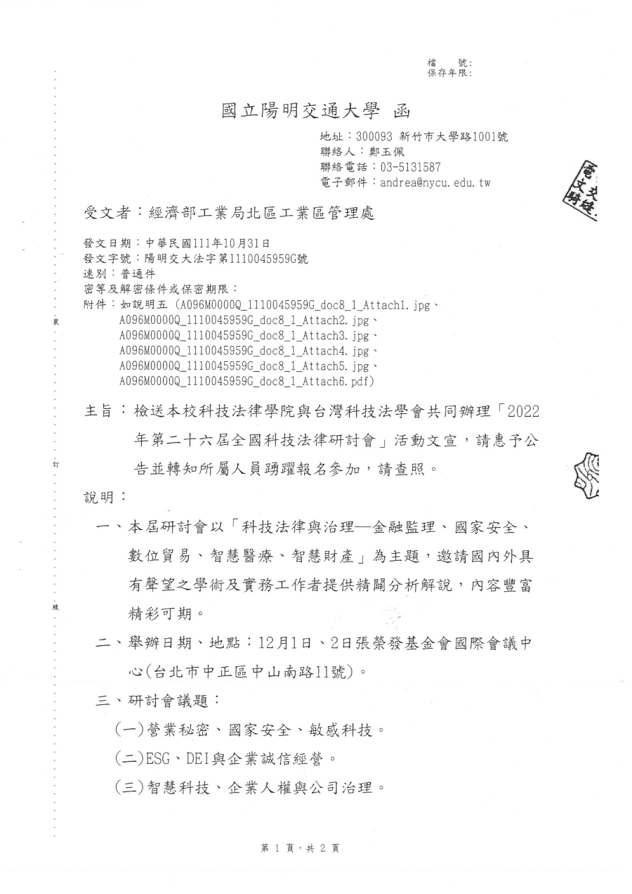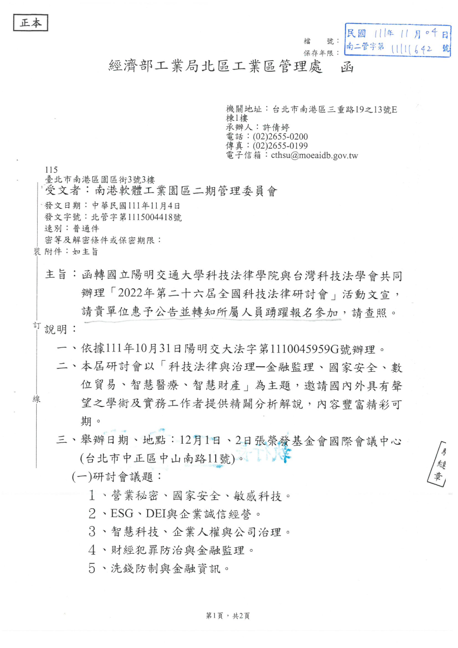 『園區公告』有關函轉國立陽明交通大學科技法律學院與台灣科技法學會共辦理「2022年第二十六屆全國科技法律研討會」活動文宣