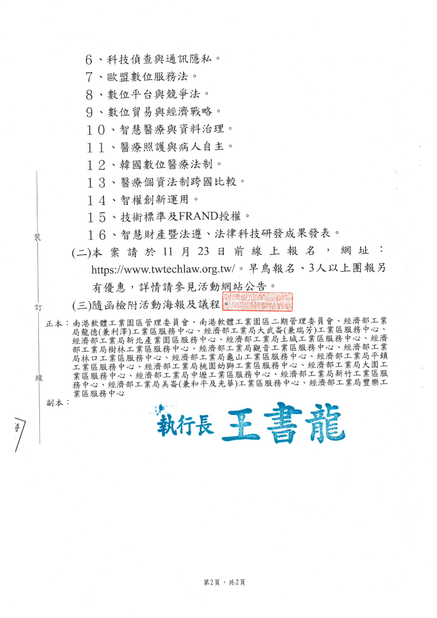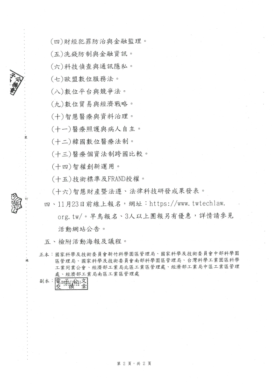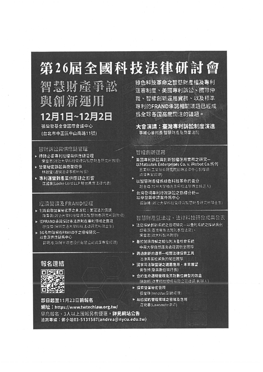 『園區公告』有關函轉國立陽明交通大學科技法律學院與台灣科技法學會共辦理「2022年第二十六屆全國科技法律研討會」活動文宣