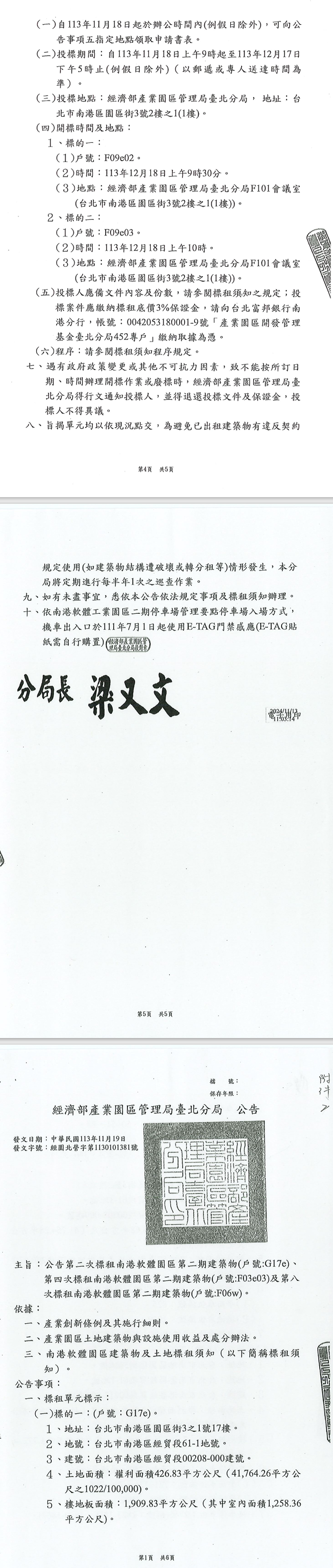 【園區公告】為有效宣傳本分局南港軟體園區第二期建築物(户 號:F09e02、F09e03)公告標租資訊(如附件1)及(戶號: G17e、F03e03、F06w)公告標租資訊(如附件2),請協助 轉知各進駐廠商或各公會會員