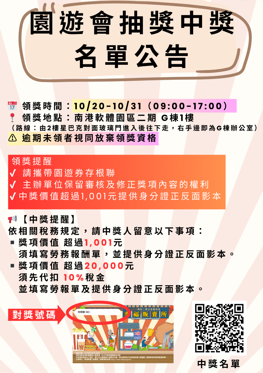 【園區公告】園遊會抽獎中獎名單公告