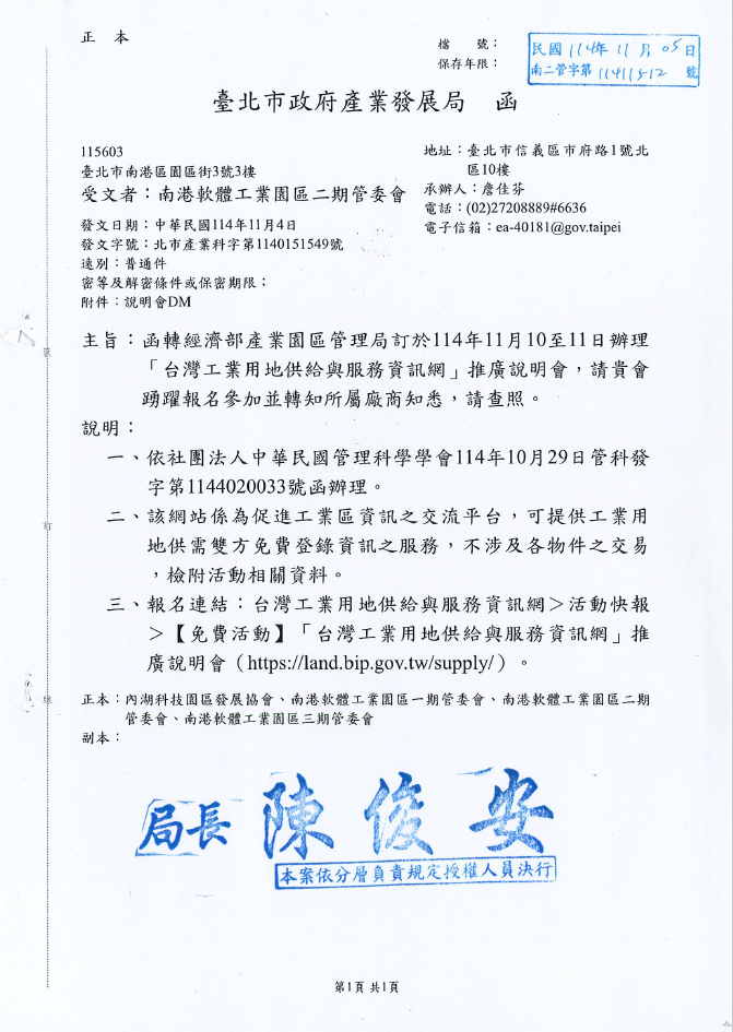 【函文公告】函轉經濟部產業園區管理局訂於114年11月10至11日辦理「台灣工業用地供給與服務資訊網」推廣說明會,請費會踴躍報名參加並轉知所屬廠商知悉,請查照。