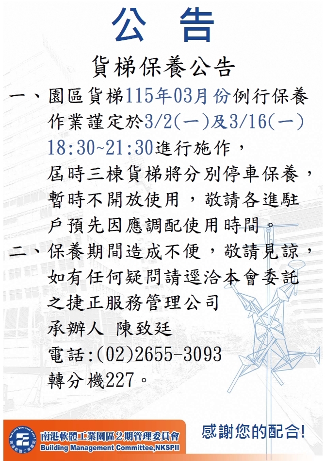【園區公告】3月份貨梯保養公告