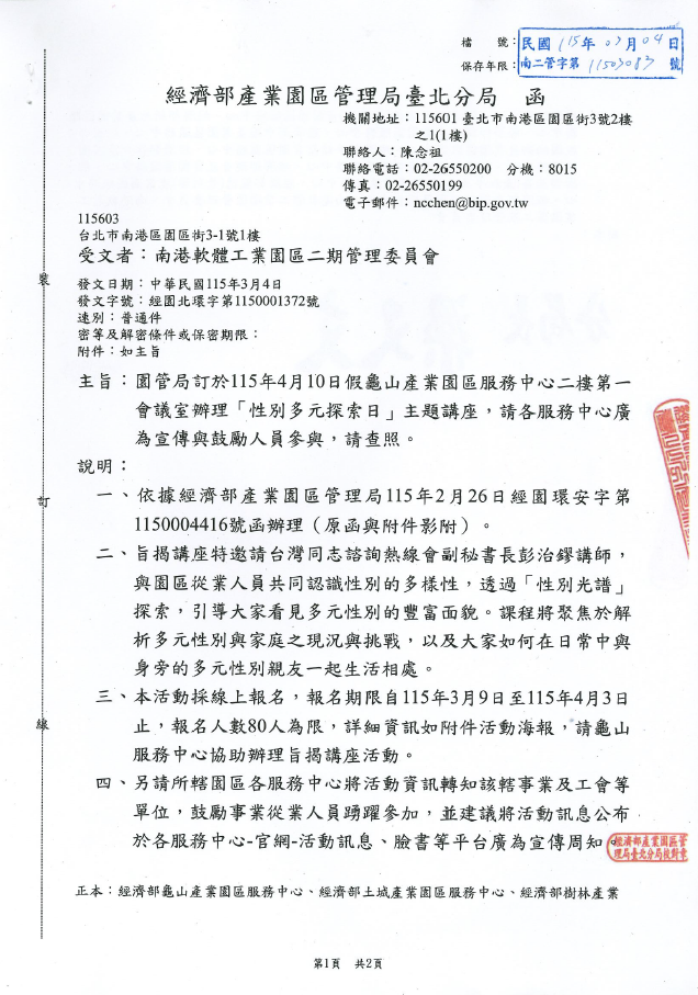 【函文公告】園管局訂於115年4月10日假龜山產業園區服務中心二樓第一會議室辦理「性別多元探索日」主題講座,請各服務中心廣為宣傳與鼓勵人員參與,請查照。