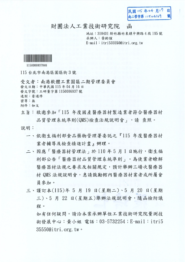 【函文公告】敬邀參加「115年度國產醫療器材製造業者符合醫療器材品質管理系統準則(QMS)檢查法規說明會」,請 查照。