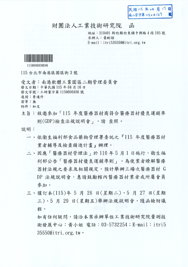【函文公告】敬邀參加「115年度醫療器材商符合醫療器材優良運銷準則(GDP)檢查法規說明會」,請查照。